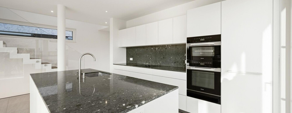 As soon as you enter the house, you are greeted by a bright, light-flooded entrance area. Custom-made built-in wardrobes made from high-quality carpentry offer practical and stylish storage solutions. The open-plan living and dining area is the heart of the house and features an impressive Bulthaup designer kitchen: a spacious cooking island, fine quarried stone from Valais, state-of-the-art Miele electrical appliances and a Bora hob with integrated extractor fan set standards in terms of functionality and aesthetics. Additional lighting elements create a warm, inviting atmosphere.